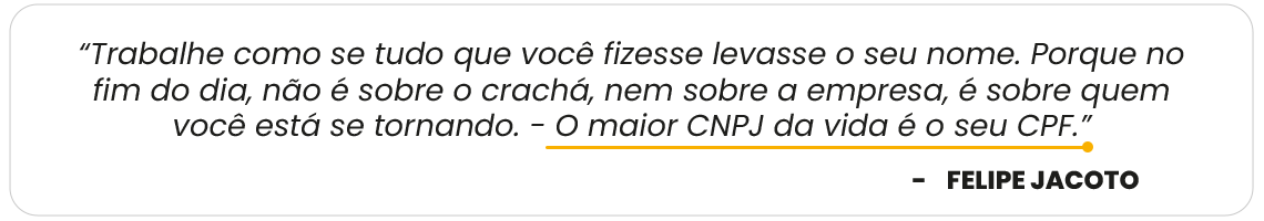 Hoje, aos 30 e poucos anos, Felipe Jacoto é o CEO do Grupo IX e uma voz influente no empreendedorismo. Ele compartilha suas experiências e filosofias sobre gestão, cultura e liderança em canais como seu perfil no YouTube e em um grupo de empresários. Sua filosofia “o maior CNPJ da sua vida é o seu CPF” resume sua crença de que o sucesso profissional está intrinsecamente ligado ao desenvolvimento pessoal e à construção de uma base sólida de autoconhecimento e maturidade. Ele é a prova viva de que é possível ser um líder criativo, estratégico e com resultados expressivos.